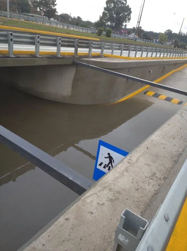 Las copiosas lluvias registradas en la madrugada del pasado sábado hicieron que se inundara uno de los nuevos pasajes subterráneos ubicados en la ruta Interbalnearia a la altura del kilómetro 36, en Pinamar.