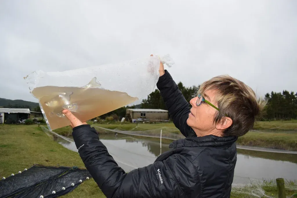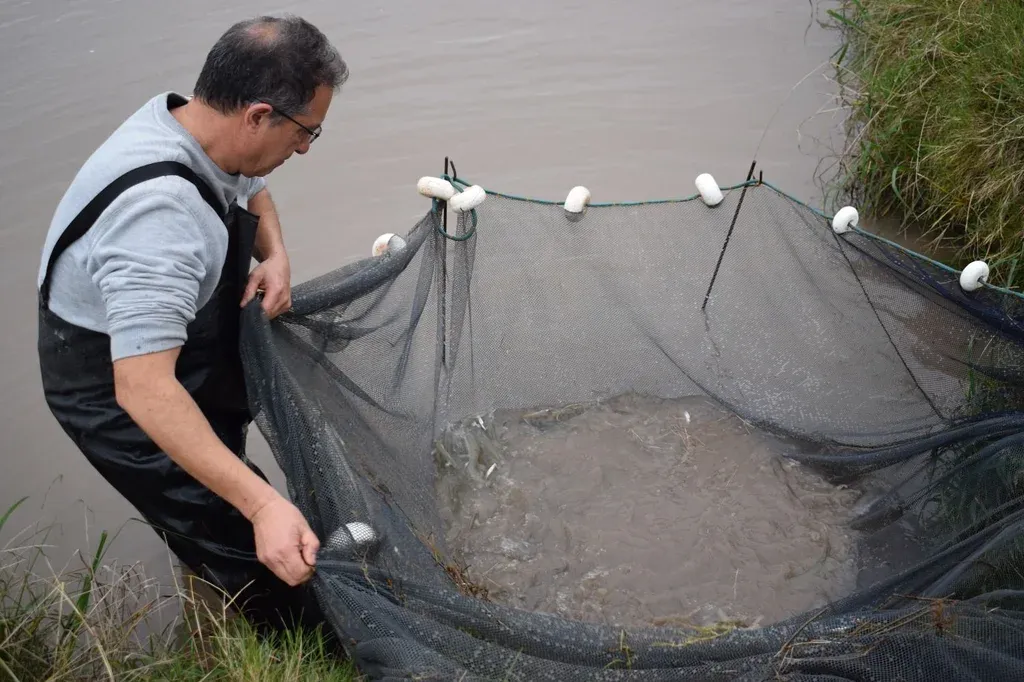 La cosecha se hace a demanda, cuando el cliente llega y formula el pedido. Se hace con el nuevo dueño de los pejerreyes presente porque es clave –para que sea eficiente la posterior adaptación al nuevo ambiente– que todo se haga rápido, dado que la supervivencia de los pejerreyes es corta, de no más de tres o cuatro horas, durante las cuales son trasladados en bolsas que contienen agua del tajamar original y oxígeno.