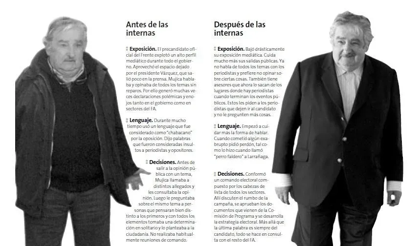 ¿Cuál fue la estrategia de su campaña? El publicista Francisco Vernazza –tal como está contado en esta nota de Sebastián Panzl – ideó una movida para cambiarle la imagen al candidato. Lo convenció de que fuera al estudio Muto y se hiciera un traje. Era la primera vez que se pondría pantalón y saco. Su equipo de campaña difundió la foto en algunos medios y, con ese gesto, comenzó a desarrollarse la estrategia de “presidencializar” a Mujica.