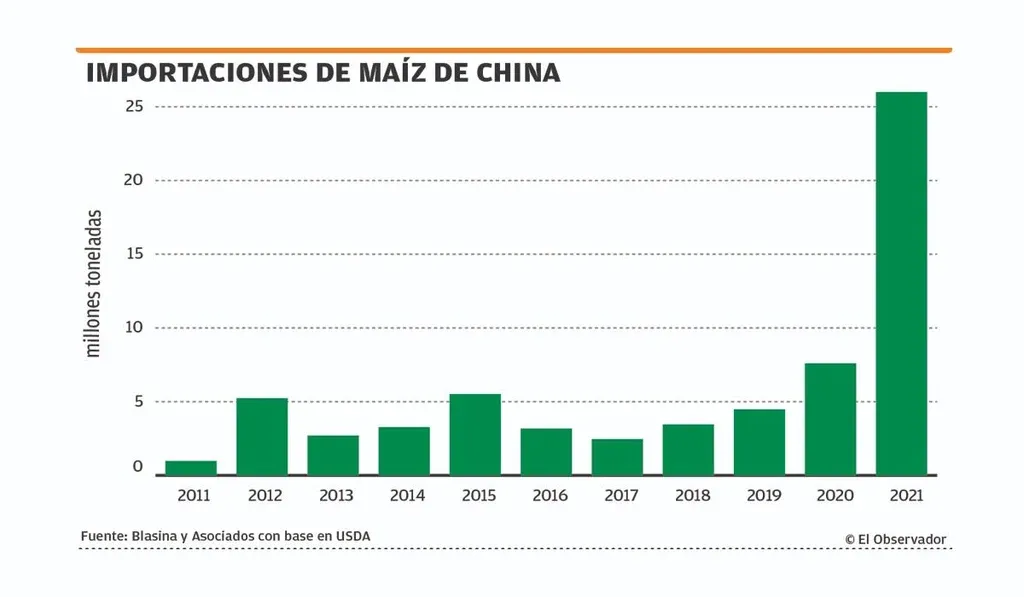 El gigante asiático será este año por primera vez en la historia el mayor importador de maíz del mundo. El Departamento de Agricultura de Estados Unidos (USDA, por su sigla en inglés) aumentó su pronóstico para las importaciones de maíz de China en 2020/21 a un récord de 26 millones de toneladas, dos millones de toneladas más que las proyectadas en febrero y casi cuatro veces más en comparación con los 7,6 millones de toneladas en 2019/20. Esta cifra se repetirá en 2021/22, según indicó el USDA en su primera proyección para el próximo año.