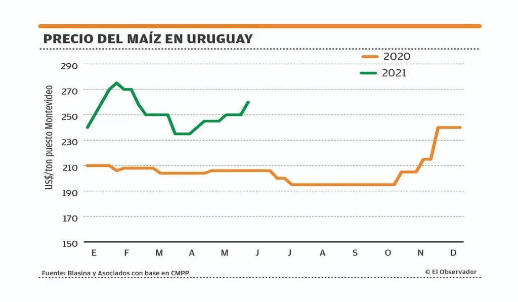 El mercado en Uruguay no es indiferente a la escalada de precio. De acuerdo a las referencias de la Cámara Mercantil, arrancaron la zafra a US$ 230 base seca y puesto en plantas y ahora se ubica entre US$ 260 y US$ 270 la tonelada. En la zafra pasada los precios apenas superaban los US$ 200.