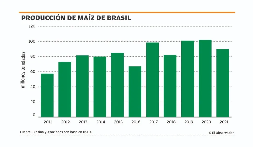 El Mercosur, habitualmente excedentario en maíz, tiene un panorama complejo. La cosecha safrinha de maíz de Brasil pierde por ahora en el entorno de 20 millones de toneladas. La consultora brasileña AgRural redujo a 60 millones de toneladas su previsión sobre el volumen de la segunda cosecha de maíz, que un mes atrás había proyectado en 65 millones y hace dos meses en 80 millones. La producción total de maíz de Brasil en el ciclo de cultivo 2020/2021 será de aproximadamente 90 millones de toneladas, en comparación con los 102 millones estimados previamente, mismo volumen cosechado hace un año atrás.