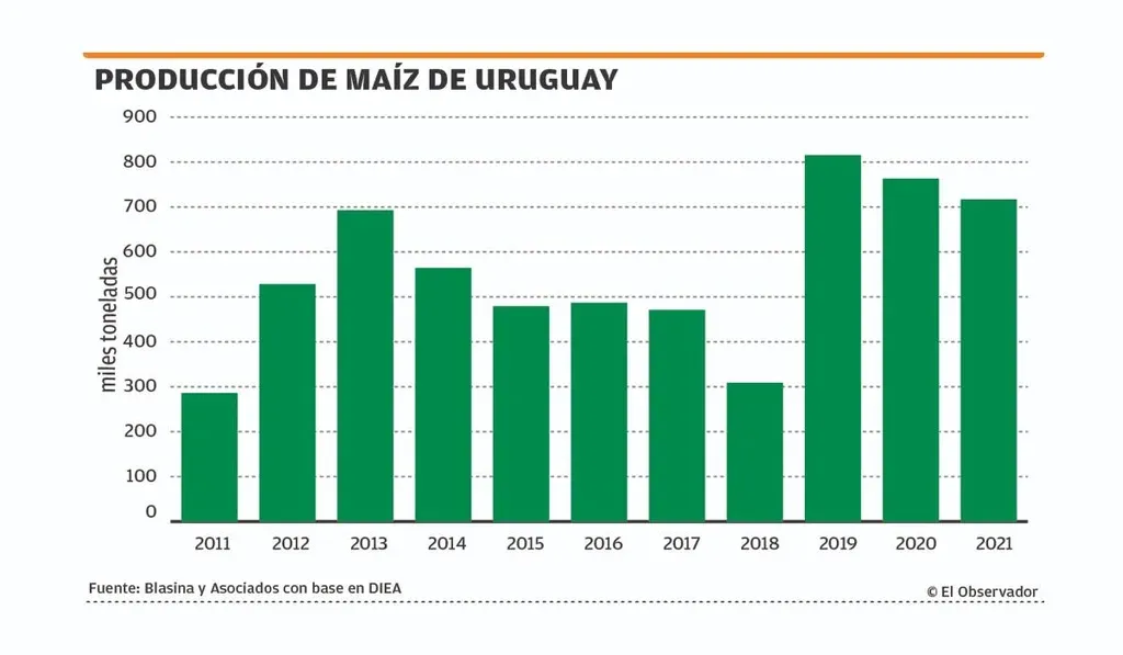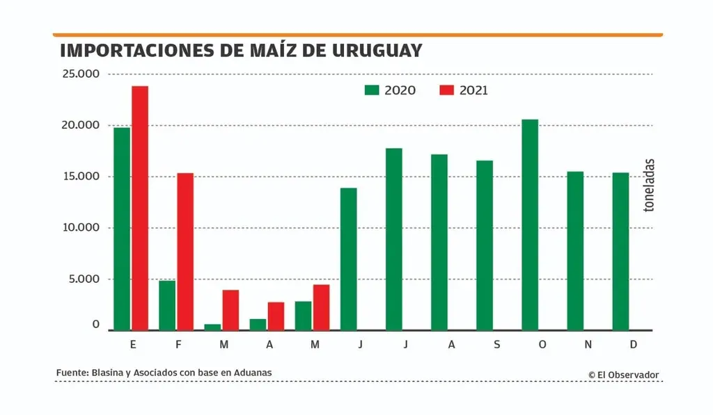 EO Sin embargo, los muy bajos rendimientos de los maíces de primera llevaron a incrementar las importaciones de maíz argentino en plena cosecha en Uruguay, fenómeno que no ocurría hace años.