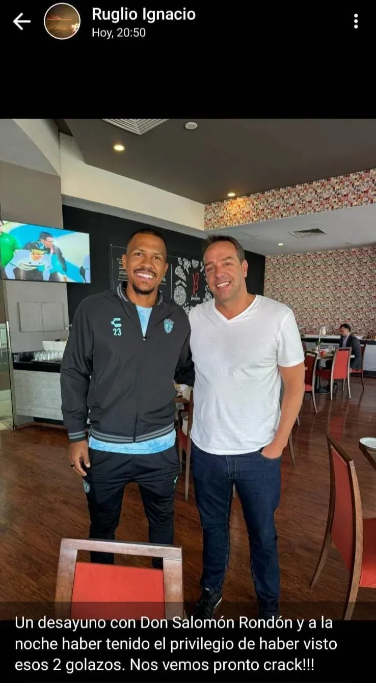 "Un desayuno con Don Salomón Rondón y a la noche haber tenido el privilegio de haber visto esos 2 golazos. Nos vemos pronto crack!!!", escribió Ruglio, al subir la foto a su estado de Whatsapp.