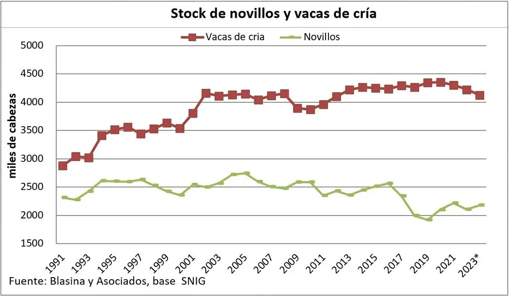 La población bovina confirma así una lógica de estabilidad. El stock de vacunos superó por única vez los 12 millones en 2016 y desde entonces se ha mantenido estable entre 11 y 12 millones de animales. De hecho, ya puede anticiparse que el año que viene bajará el stock por una menor producción de terneros que se contabilizarán el año próximo, fruto del entore pasado. No caerá dramáticamente el porcentaje de destete, pero será modesto y a eso se sumará un volumen algo menor de vientres entorados y una salida importante de terneros y novillitos en pie.