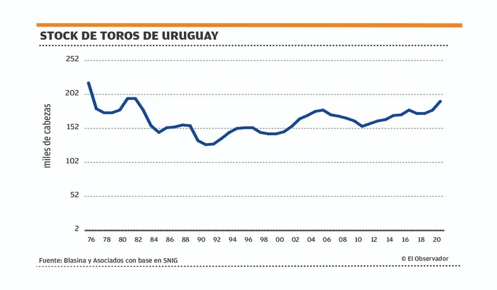 En el caso de los toros, la población también aumentó fuerte en el último año. Un crecimiento de 7,3% en un año y la mayor cantidad de toros desde 1981, hace 39 años.