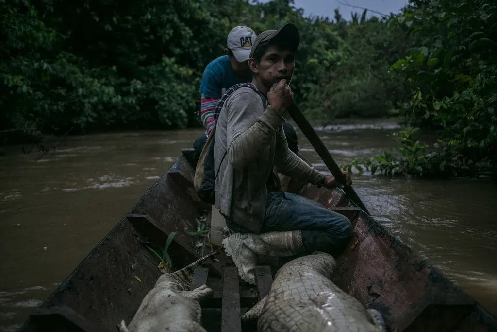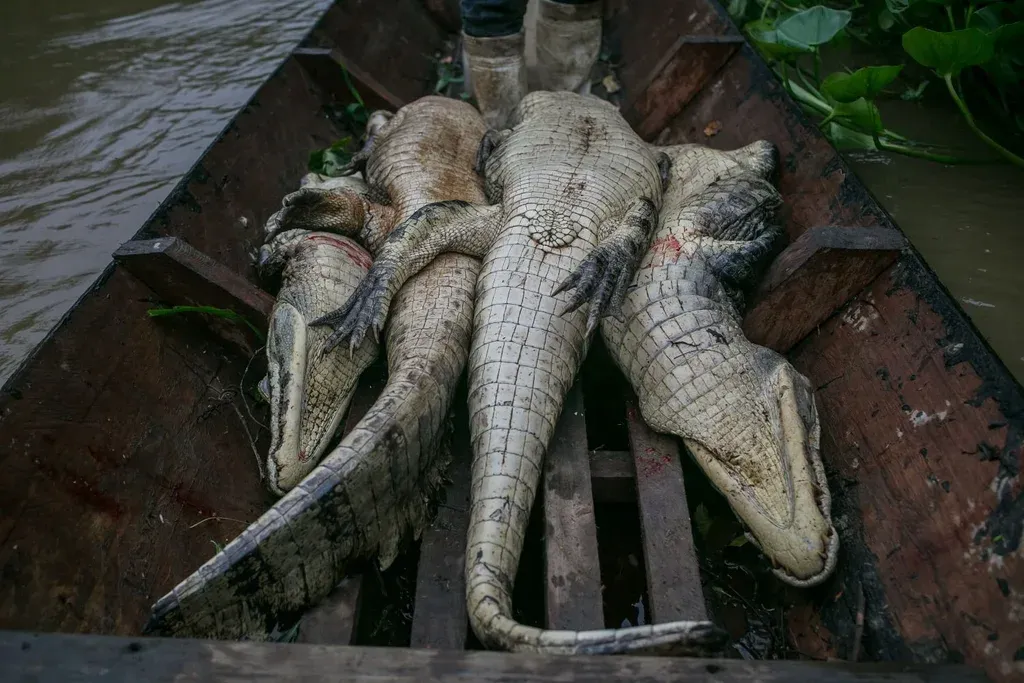 La caza empezó al anochecer, con la luz de una media luna y un coro de ranas que pronto se callaron cuando escucharon el sonido de los rifles. Los cuerpos fueron arrastrados a la cubierta de tres barcos: fueron seis caimanes esa noche y 14 en la siguiente. Algunos medían hasta 2,5 metros.