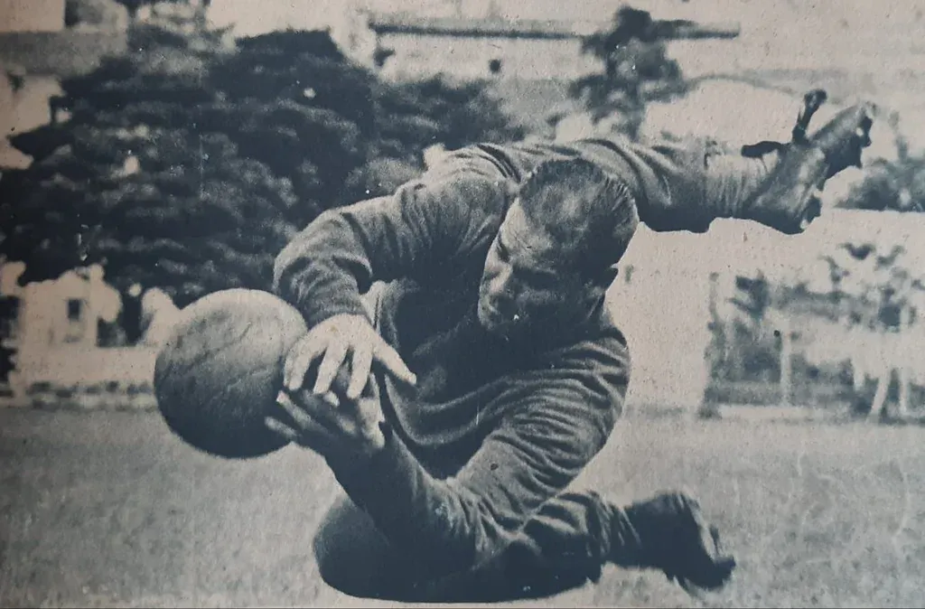 Luis Maidana volando en una práctica de Peñarol en la década de los años de 1960