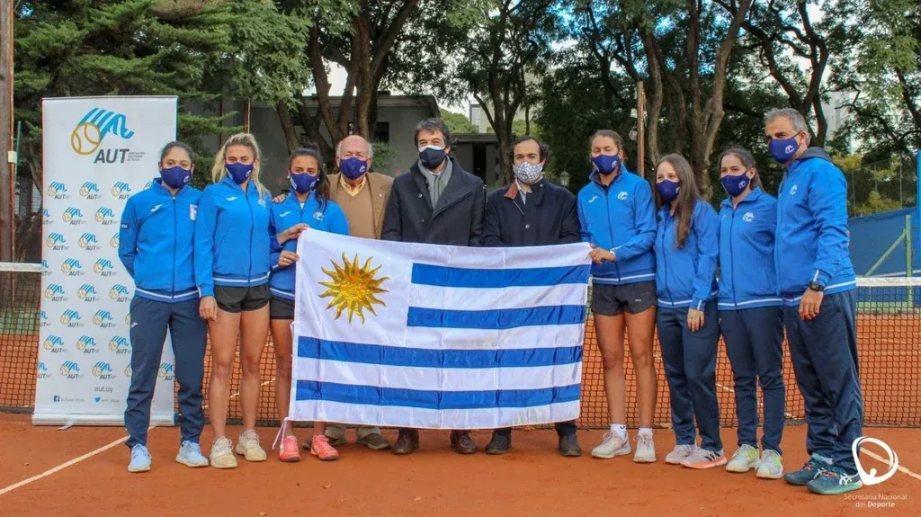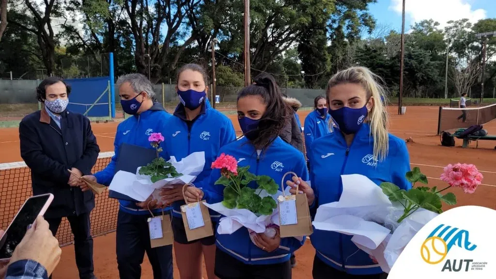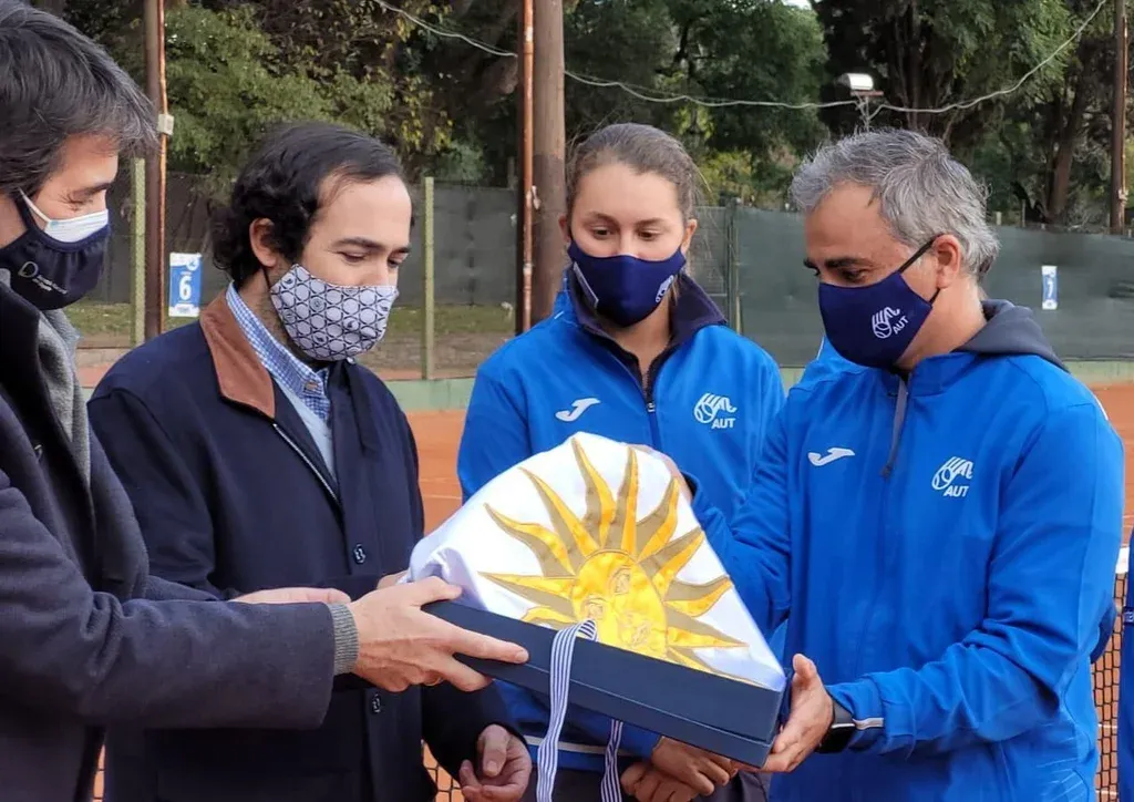 El equipo uruguayo para la Billie Jean King Cup, Grant (N° 1), Rodríguez (N° 2) y Tiscornia (N° 3), recibió el pabellón