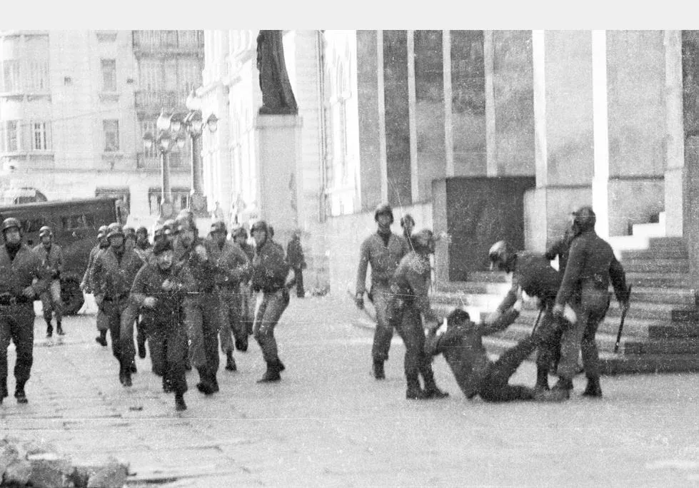 El punto de llegada había sido fijado en la explanada de la Facultad de Derecho. Unos años antes del episodio que Giambruno va a retratar ese domingo –paradójicamente– la fachada de la facultad apareció en un aviso propagandístico a favor de la papeleta del Sí del plebiscito de 1980. El edificio se veía inmaculado, iluminado por la luz del sol de la tarde, con la frase: “Antes era una fábrica de bombas, ahora es una casa de estudios”.