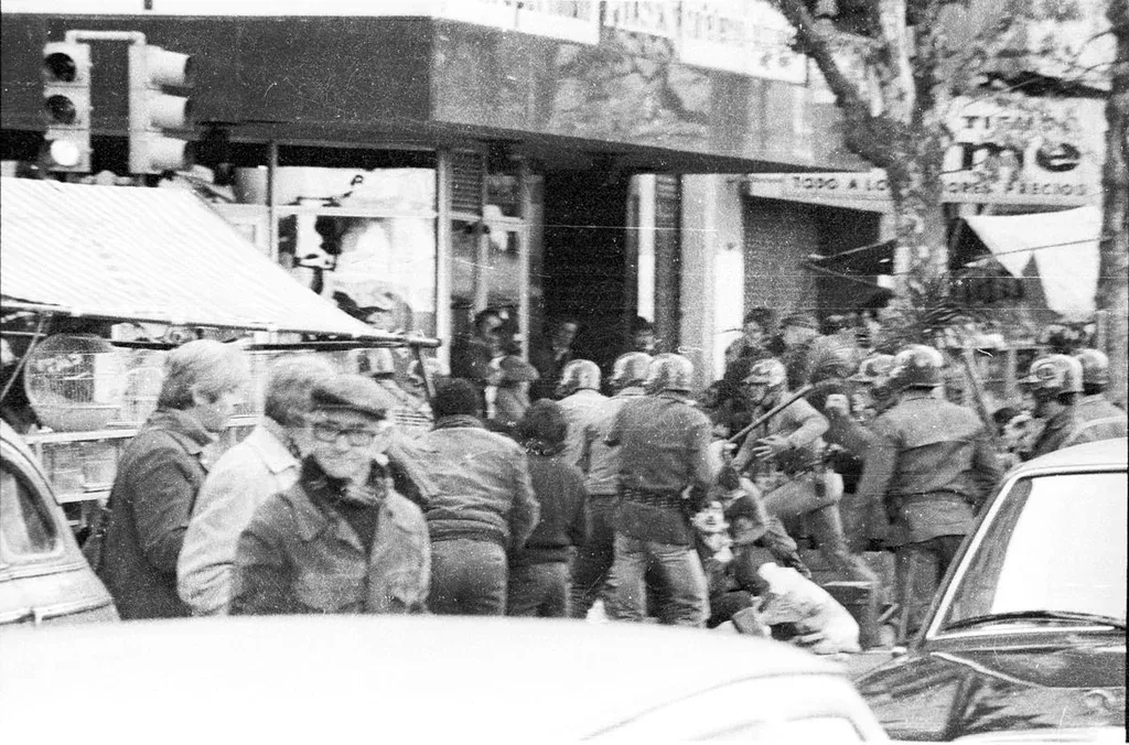 Como respuesta al cierre del semanario La Democracia un grupo de frenteamplistas, colorados y blancos sale a manifestarse. Juntos piden democracia, libertad de prensa, amnistía para los presos políticos. Los fotógrafos de la agencia Camaratres, que hace un rato recorren la zona, detectan policías y efectivos de la Guardia Republicana en varios puntos del recorrido de la marcha.