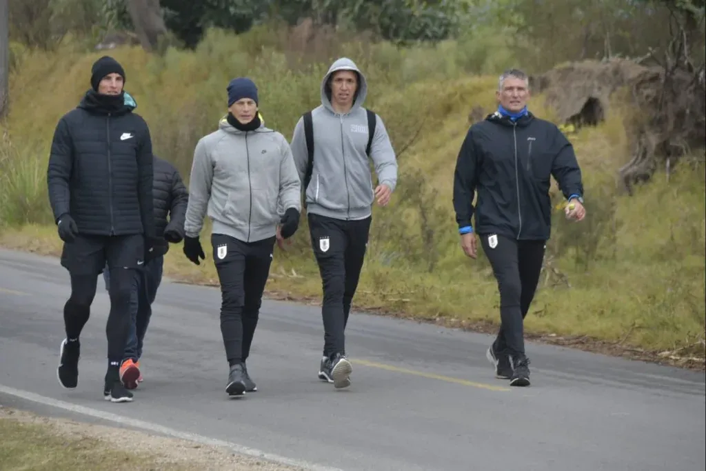Luego de pedalear hasta el Parque Roosvelet, las bicicletas fueron levantadas por un camión. Los futbolistas, muy abrigados, con botellitas de agua y acompañados por seguridad privada a pie y en moto, caminaron por el costado de la ruta ante el asombro de la gente que los cruzaba.