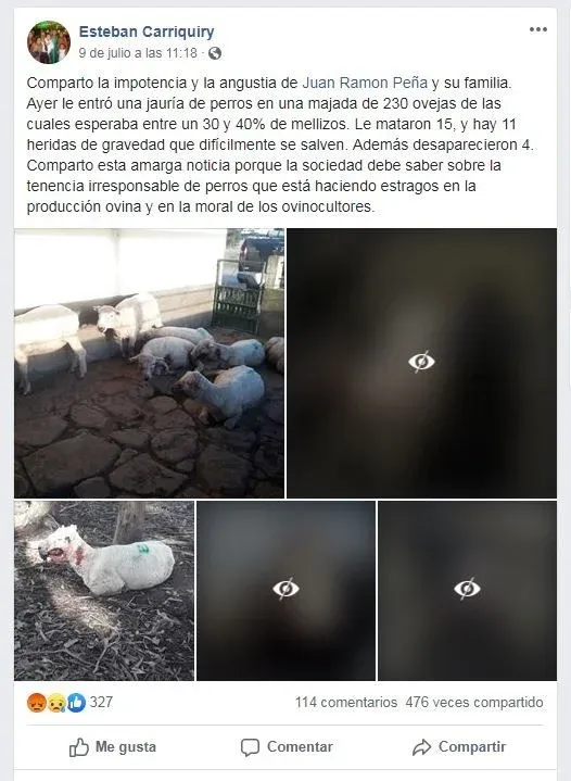 Según comentó el ganadero, varios fueron los productores que se solidarizaron con este caso y compartieron “esta amarga noticia” para que la sociedad se informe sobre la tenencia irresponsable de perros que está “haciendo estragos en la producción ovina y en la moral de los ovinocultores”.