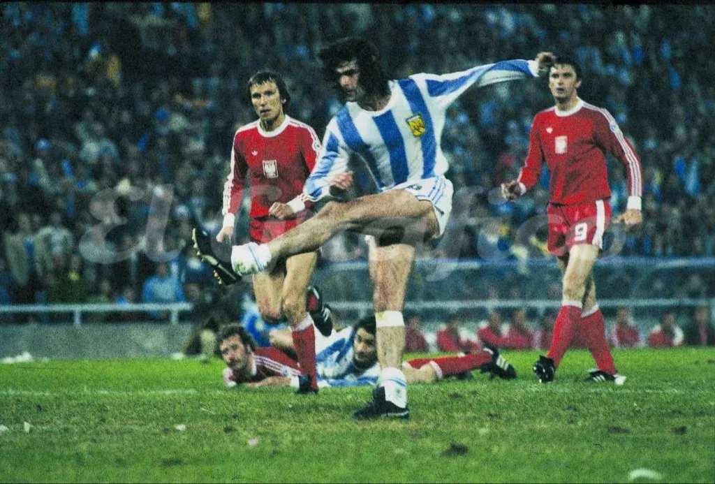 Mario Kempes ante Polonia con la famosa cinta que usó desde el Mundial 78 hasta que dejó de jugar