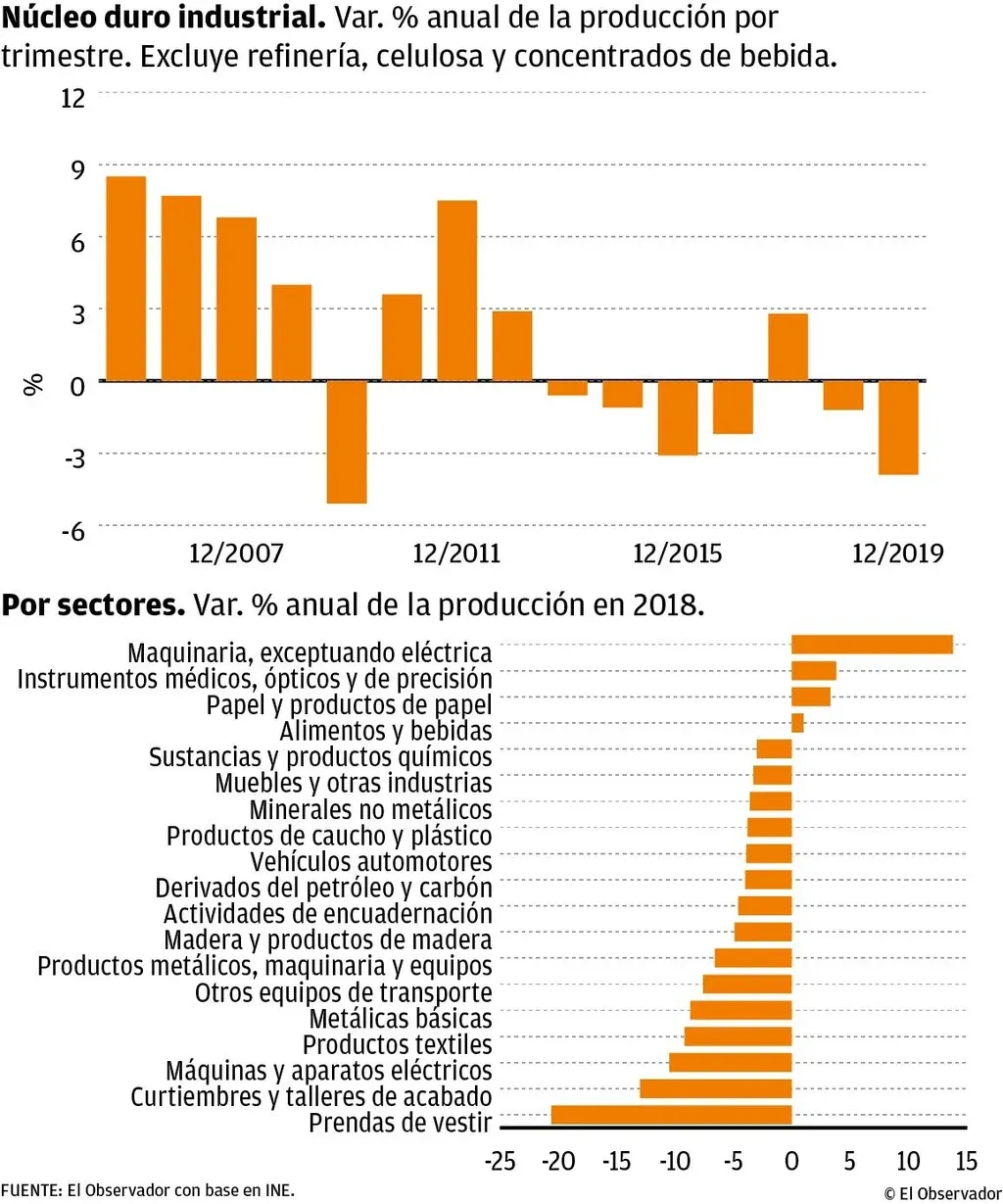 Los datos difundidos el martes por el Instituto Nacional de Estadística (INE) procesados por El Observador muestran una caída de 3,9% en el promedio del último año en el núcleo duro industrial. Ese deterioro fue mayor al retroceso de 1,2% de 2018.