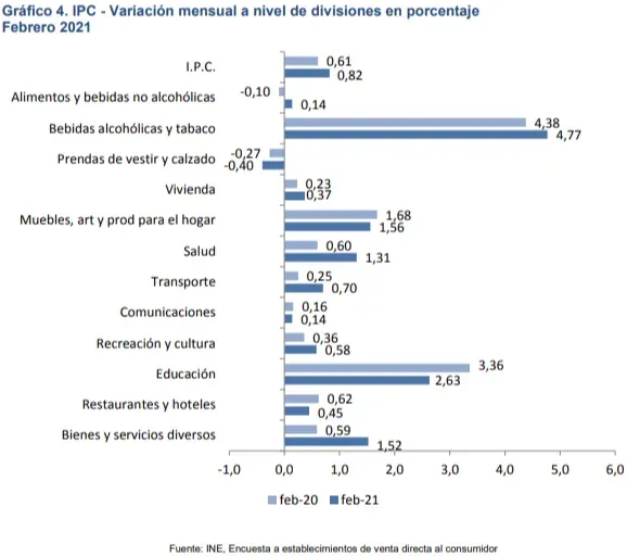 Las principales divisiones que incidieron en la suba de los precios en febrero fueron: alimentos y bebidas no alcohólicas (0,04%), bebidas alcohólicas, tabaco y estupefacientes (0,21%), muebles, artículos para el hogar y para la conservación ordinaria del hogar (0,10%), salud (0,10%), educación (0,10%) y bienes y servicios diversos (0,10%), según el INE.