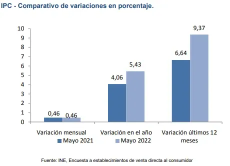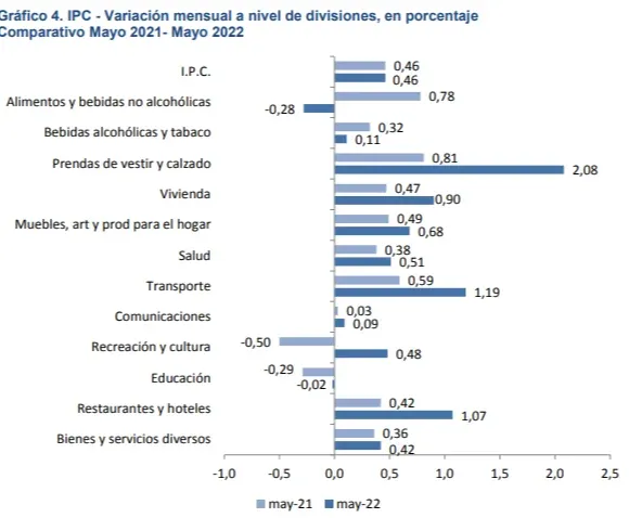 De acuerdo al comunicado del INE, las principales incidencias en la variación mensual del IPC en mayo provienen de: alimentos y bebidas no alcohólicas (-0,08), prendas de vestir y calzado (0,07), vivienda (0,12), transporte (0,12) y, restaurantes y hoteles (0,09).