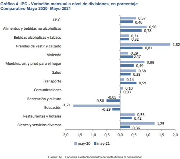 Las principales incidencias en la variación mensual del IPC de mayo fueron las siguientes divisiones: alimentos y bebidas no alcohólicas (0,22%), vivienda (0,07%) y transporte (0,06%). En los alimentos, sobresalió la suba de la división carnes (2,04%), aceite y grasas (3,68%), legumbres y hortalizas (0,7%), y azúcar, mermeladas, miel, chocolates y dulces (1,6%). En la otra vereda, las frutas mostraron un descenso mensual en promedio de 4,58% respecto a abril, según el INE.