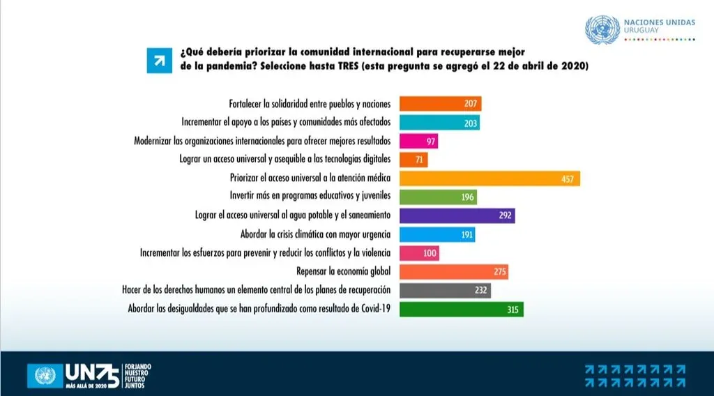 Por otro lado, en lo relativo a la pandemia, los uruguayos que participaron en la encuesta entienden que lo primero que tendría que priorizar la comunidad internacional para recuperarse es "el acceso universal a la atención médica" (457 votos) seguido por "abordar las desigualdades que se han profundizado como resultado del covid-19" (315). Aunque la primera opción fue la más votada, las autoridades destacaron que no fue tan preferida como en otros países donde el sistema de salud es de menor calidad y alcance que el que tiene Uruguay.