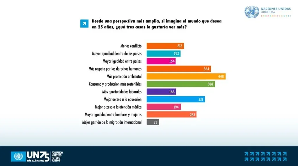 Esta inquietud por el medio ambiente se repite: al ser consultados por las tres cosas que a los uruguayos más les gustaría ver más en 25 años, la opción con mayor apoyo (448 votos) fue "más protección ambiental". Apenas detrás (388), y en sintonía con la problemática, aparece el deseo de un "consumo y producción más sostenibles". Los encuestados colocaron en tercer lugar el anhelo de que haya "más respeto por los derechos humanos".
