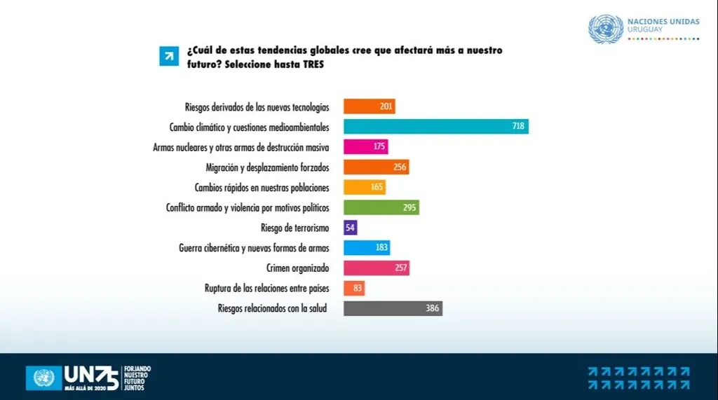 Uno de las principales preocupaciones de los uruguayos encuestados es el medio ambiente. Según la medición, la gran mayoría (718 personas de los 975 que respondieron) cree que el "cambio climático y cuestiones medioambientales" será lo que más afectará al futuro del planeta. En segundo lugar, elegida por 386 personas, aparece la opción "riesgos relacionados con la salud" y en tercer término (295 apoyos) "el conflicto armado y la violencia por motivos políticos".
