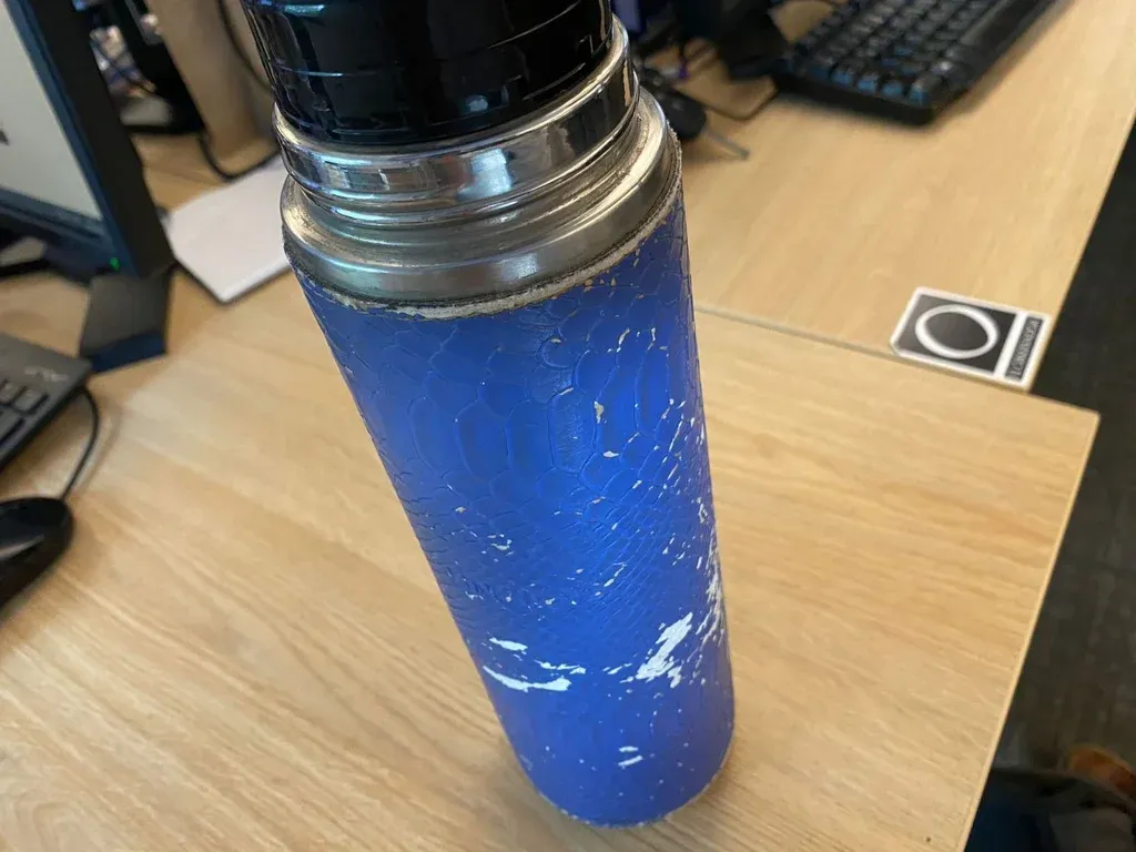 "Se trata de un termo o botella térmica con un exterior de textura similar a la piel de serpiente en color azul. La tapa es negra y parece tener un diseño de múltiples capas, lo que podría indicar una función de aislamiento térmico avanzado. Sin embargo, el exterior muestra signos de desgaste, con el revestimiento azul despegándose en varias áreas". (Por favor, apiádense de Mandy y mándenle un nuevo termo).