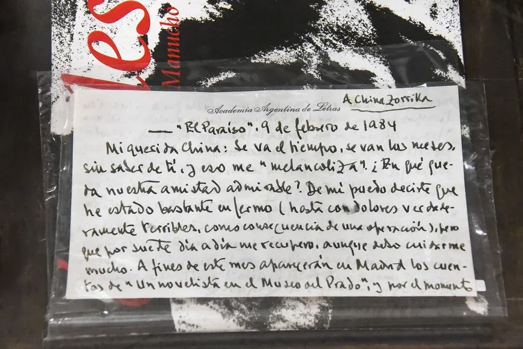 Una carta que le mandó el escritor argentino Manuel Mujica Lainez días antes de su muerte da cuenta de la amistad entre los dos. "Es una carta que tiene el membrete de la Academia Argentina de Letras a la cual Manuel Mujica Lainez pertenecía y está situada en El Paraíso, que es su casa en las afueras de córdoba", comenta González mientras saca la hoja de papel de un sobre de plástico. "Mi querida China, se va el tiempo, se van los meses sin saber de ti y eso me "melancoliza". ¿En qué quedó nuestra amistad admirable?", comienza la misiva del escritor.