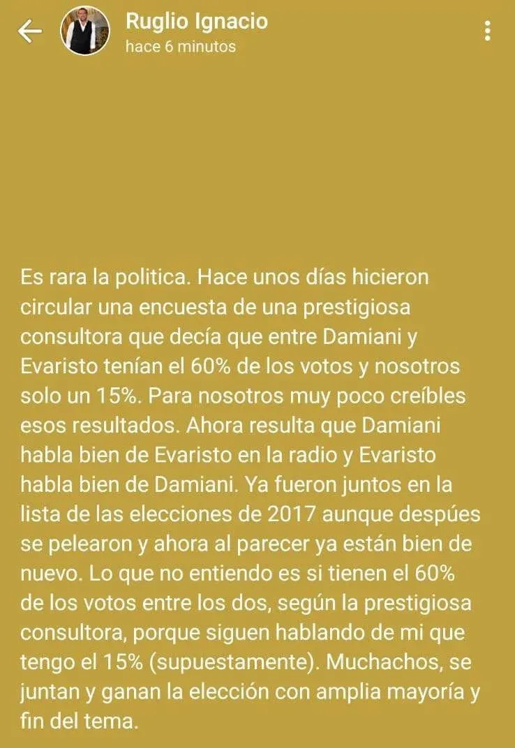 "Es rara la política. Hace unos días hicieron circular una encuesta de una prestigiosa consultora que decía que Damiani y Evaristo tenían el 60% de los votos y nosotros un 15%. Para nosotros, muy poco creíbles los resultados", comenzó escribiendo Ruglio.