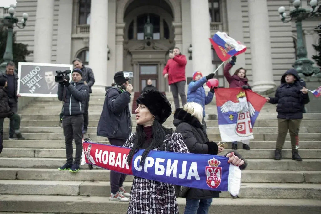 Manifestantes a favor de Djokovic en frente a la Asamblea Nacional de Serbia