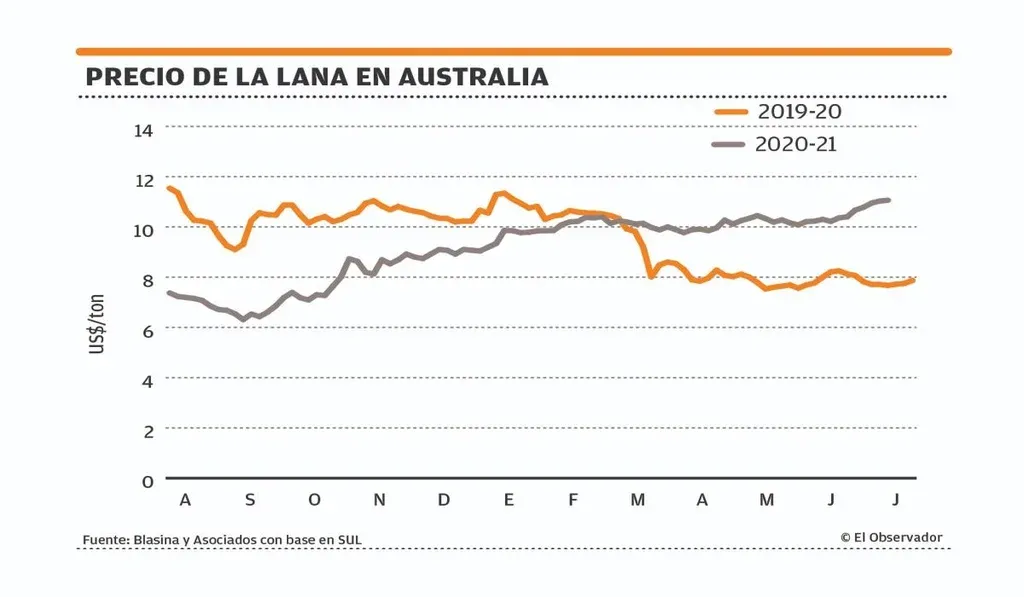 El precio de la lana en Australia mantiene la tendencia al alza, pero a menores tasas, buscando equilibrarse hasta el fin de la zafra 2020/21 en valores por encima de los US$ 11 por kilo base limpia.