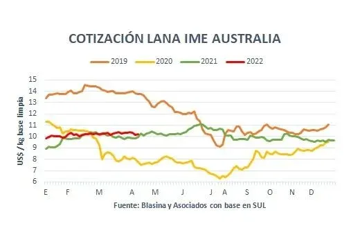 La cotización de la lana en Australia bajó 1,5% y volvió a los niveles de precio de principios de marzo. El Indicador de Mercados del Este (IME) cerró a US$ 10,20 por kilo base limpia, frente a US$ 10,36 de la semana anterior.