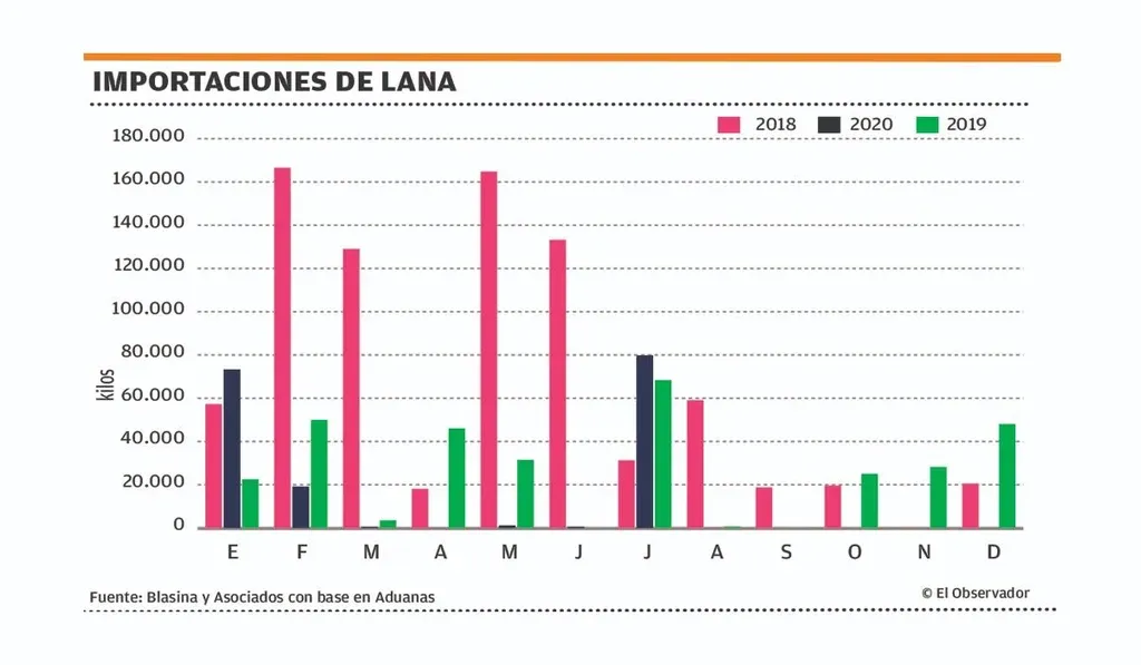 Las importaciones de lanas y tejidos de Uruguay bajaron 22% en volumen en lo que va del año: 174.607 kilos respecto a los 222.941 de un año atrás. Brasil es el principal proveedor con una participación de 67% seguido de China con un 13%.
