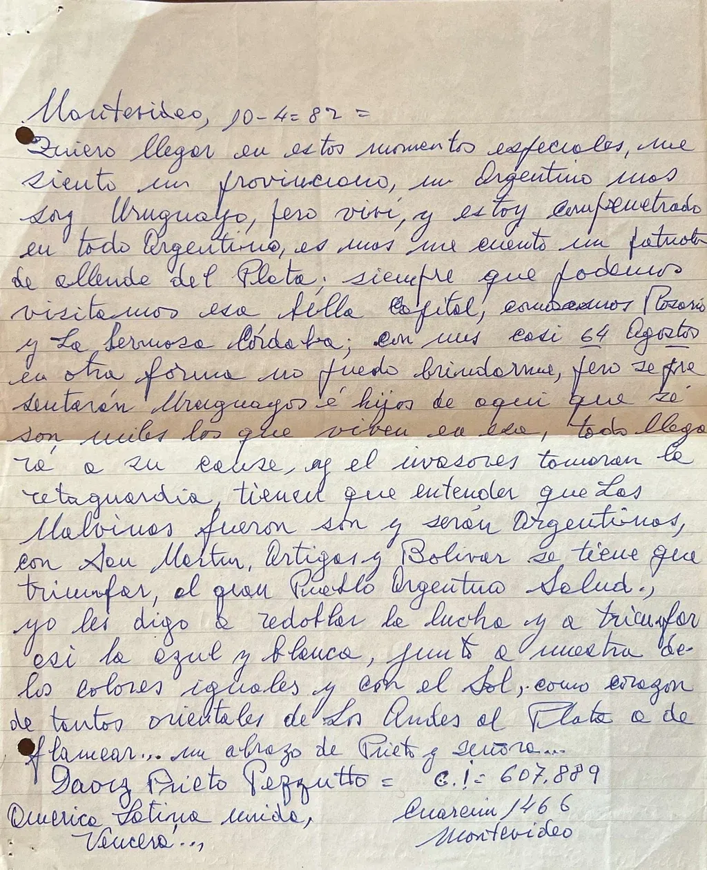 Carta de un uruguayo solidario con la causa argentina enviada desde el mismo lugar en el que hoy está ubicada la embajada