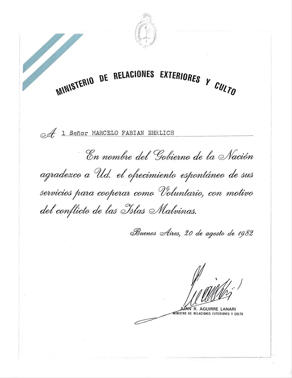 Dice que no se anotó para figurar, que no fue una locura juvenil sino una reacción lógica, que estaba convencido y que era consciente de los riesgos que implicaba su decisión. Antes de ir al consulado lo había hablado con su esposa y se había ocupado de arreglar la parte legal por si no volvía. Cada día se despertaba con la pregunta de si lo iban a llamar. Vivió esas diez semanas con tensión e incertidumbre. Estaba esperando la convocatoria, pero la guerra terminó antes y hasta donde se sabe ni él ni el resto de los 762 fueron convocados al frente de batalla. Cuatro décadas después reafirma su decisión con la misma convicción de aquel tiempo: no dudaría en hacerlo de vuelta.