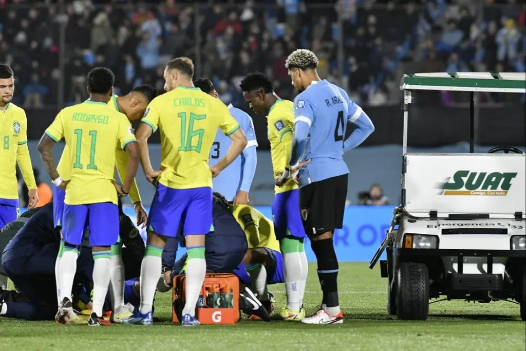 El 10 de Brasil cruza la mitad de la cancha con pelota dominada. En una acción de juego, el jugador visitante choca con De la Cruz, da dos pasos, uno de ellos con la inestabilidad de la rodilla que no le responde y comienza la caída en el momento que se encuentra con Ugarte.