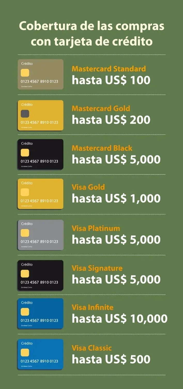 Cuando se trata de las tarjetas de menor valor como Visa Classic el beneficio es opcional y se ciñe a lo que resuelva el banco emisor, en este ejemplo la cobertura puede variar desde los US$ 500 hasta los US$ 5.000 . Asimismo, en el caso de la tarjeta Infinite también el banco puede decidir si elevar el beneficio hasta US$ 40.000 por evento y por cuenta por un periodo de 12 meses.
