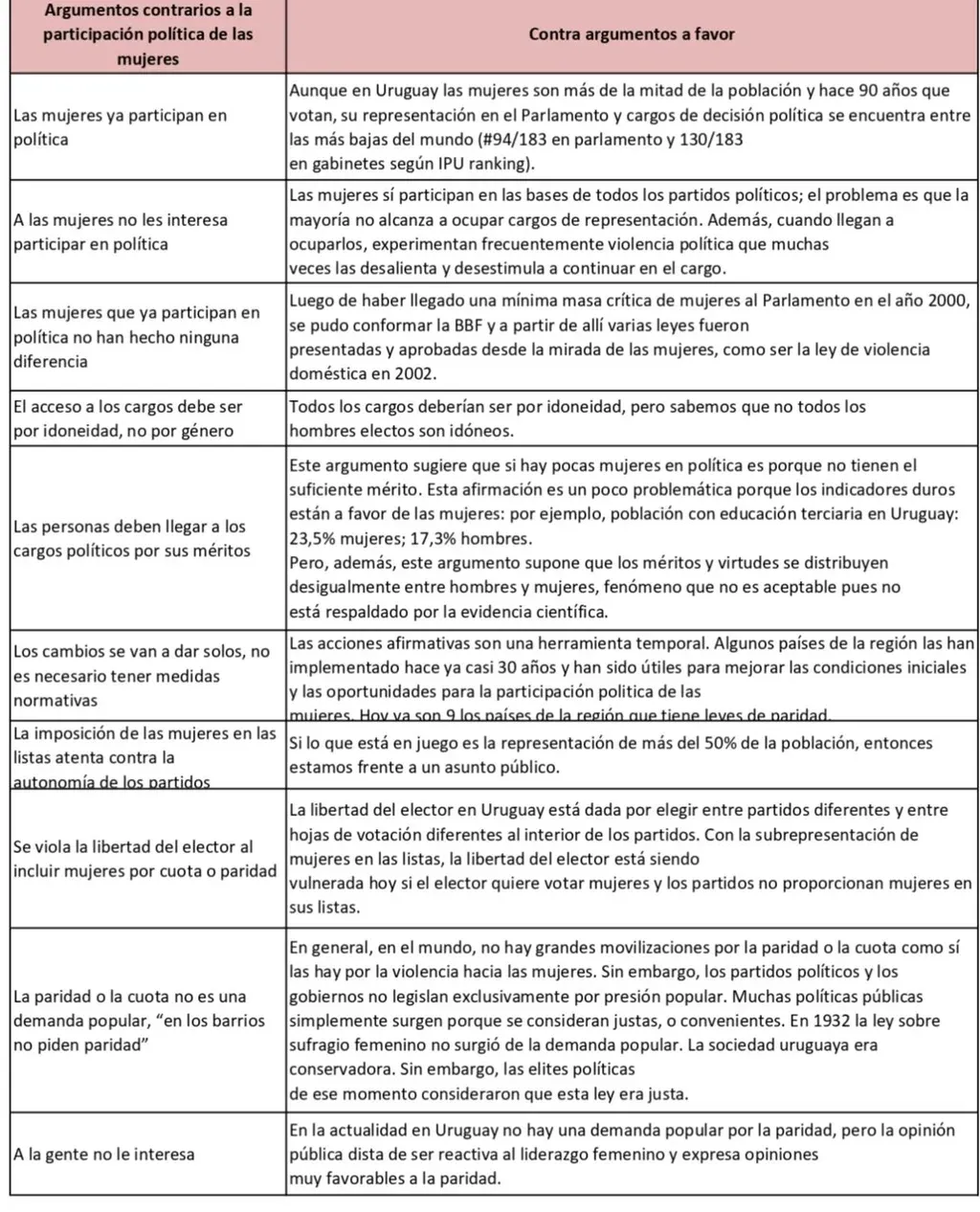 En ese sentido, ONU Mujeres elevó a la discusión parlamentaria de ayer una serie de contra-argumentos a los “prejuicios” que suelen impedir que Uruguay avance hacia la paridad. Explicó que "las mujeres sí participan en las bases de todos los partidos políticos; el problema es que la mayoría no alcanza a ocupar cargos de representación", y que "todos los cargos deberían ser por idoneidad, pero sabemos que no todos los hombres electos son idóneos".