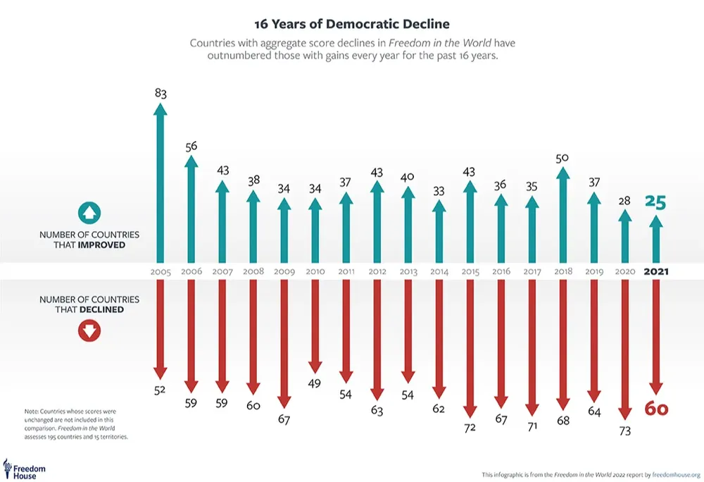 Con esta sentencia comienza el nuevo informe de la Organización Freedom House “La libertad en el mundo 2022”. Se señala que un total de 60 países tuvieron un retroceso de sus libertades el pasado año, mientras que solo 25 han mejorado. La amenaza actual a la democracia es producto de 16 años de declive sistemático de la libertad en el mundo. Estos datos son consistentes con el Democracy Index publicado por The Economist, el cual analizamos en la anterior nota de este espacio. Conversaba hace algunos días con unos colegas recordando cuando se organizó en Uruguay el Congreso Latinoamericano de Ciencia Política en 2017, el cual se titulaba “¿democracias en recesión?”. En ese momento aún parecía prematuro diagnosticar a la democracia “en recesión”. Hoy ya no lo es. El asedio a la democracia liberal se torna cada vez más evidente, desde Nicaragua, hasta Myanmar. Luego de la Segunda Guerra Mundial, Naciones Unidas como otras instituciones globales han ayudado a transitar el camino de garantizar los derechos fundamentales de las personas y el Derecho Internacional. En grandes trazos, la segunda ola democratizadora de los 50’ y 60’, así como la tercera ola entre los 80' y 90' se enmarcaron en ese avance democrático, de transiciones o consolidaciones democráticas, con algunas contramarchas en el medio. Pero había un camino.