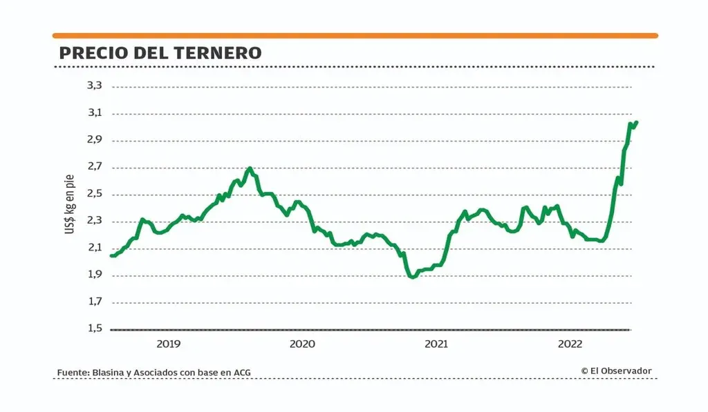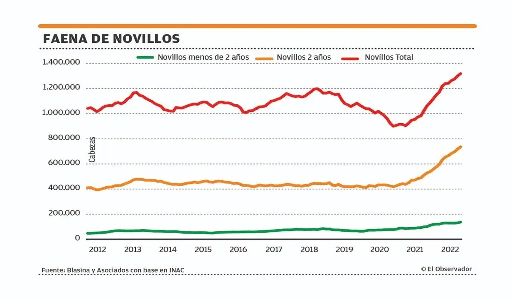 Uruguay logró un récord de tres millones de terneros hace dos años y desde entonces se mantiene en una producción cercana a 2,9 millones. Este año la sequía en el norte llevará a una producción similar, que será la que estará disponible en el otoño de 2023.