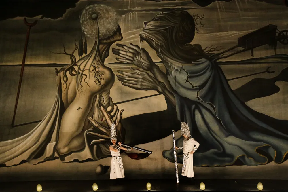 Las acrobacias se intercalan con una pareja de clowns que tratan de desmitificar el telón de Dalí (“Tiene dos rajaduras”, “tiene hormigas gigantes”, “voy a hablar con un amigo mío para que le haga unos retoques”, bromean en un castellano mezclado con italiano). Sus números son graciosos, aunque también protagonizan uno que no está a la altura del espectáculo, en el que juegan a disparar al público con unas varas situadas en sus genitales.