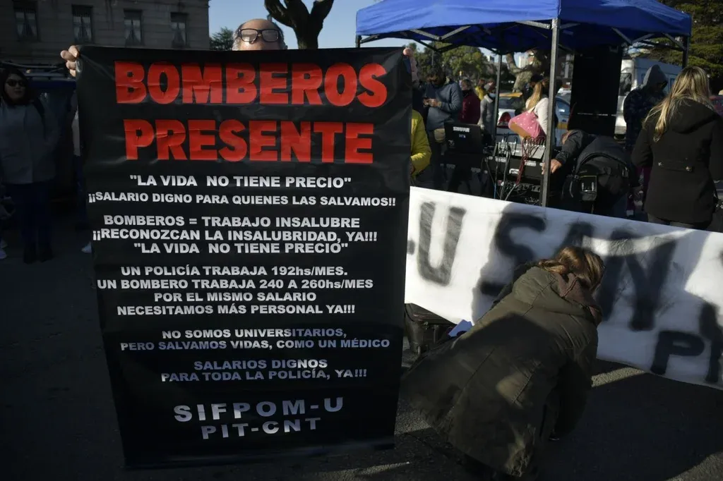 Cuando terminó el discurso del policía del INR llegó el del representante de Bomberos. Habló de la falta de funcionarios, de que su flota sigue "andando con alambres", que saben que siempre puede ser su último día, que en sus cabezas ven a la gente que perdieron en el incendio y piensan que pueden ser sus familias.