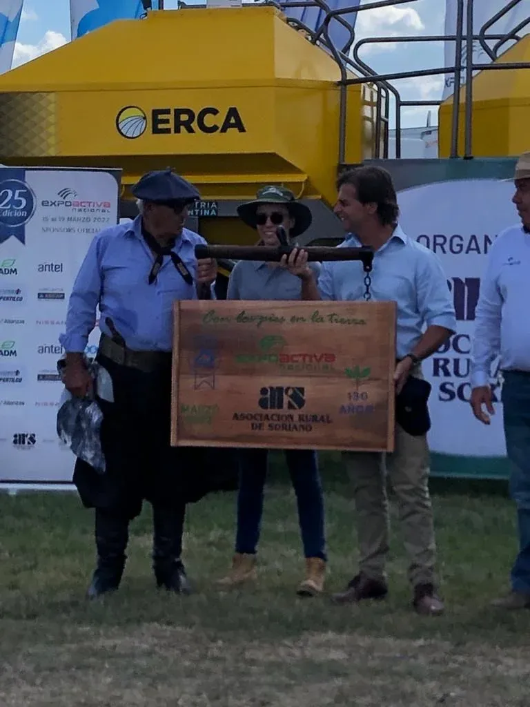 Lo que recibió, de parte de la Asociación Rural de Soriano (ARS) –organizadora de la exposición creada en 1992–, fue un cartel en madera con el eslogan de la actividad: “Con los pies en la tierra”, más los logos distintivos de la gremial y de la exposición, la fecha y el dato de los años que tiene la gremial: 130 ya.