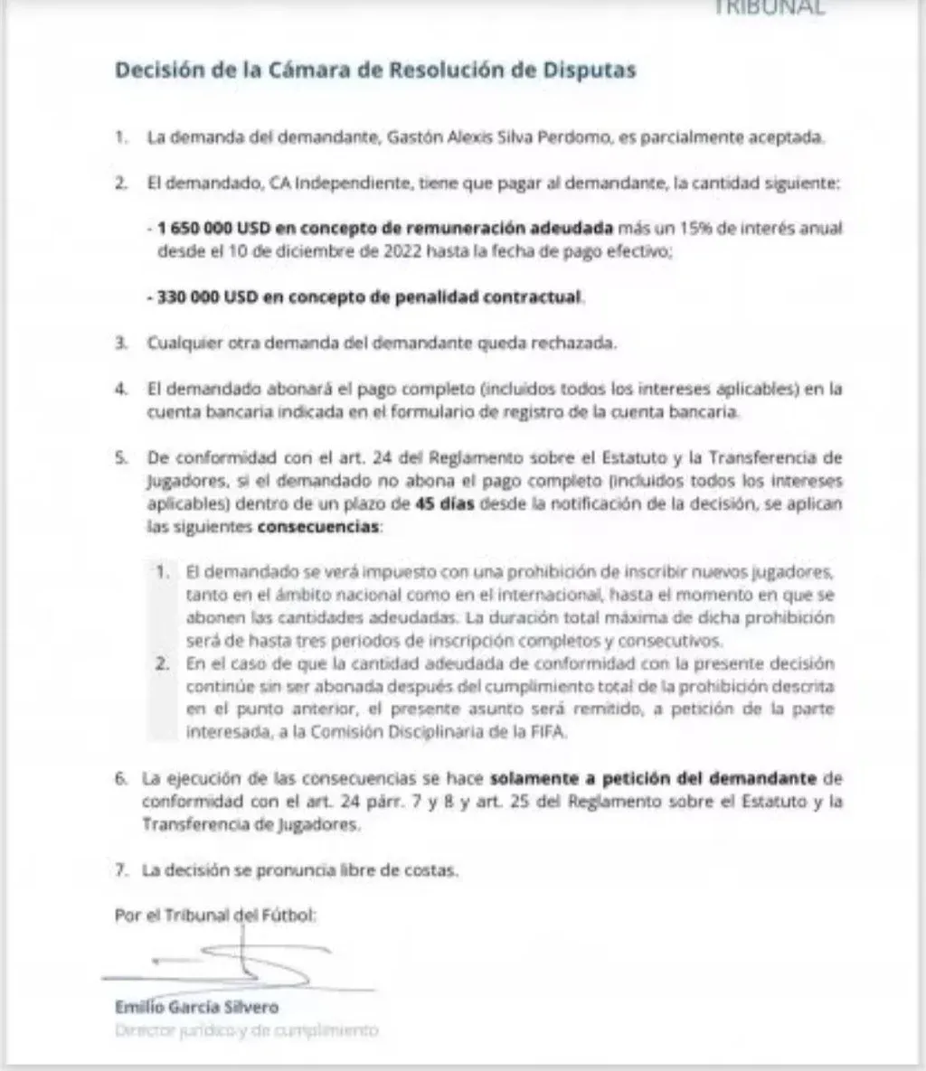 La Cámara de Resolución de Disputas del Tribunal de Arbitraje en el Deporte (TAS por su sigla en inglés), falló a favor del exfutbolista de la selección uruguaya Gastón Silva en una demanda que el lateral le inició hace años a Independiente de Avellaneda.
