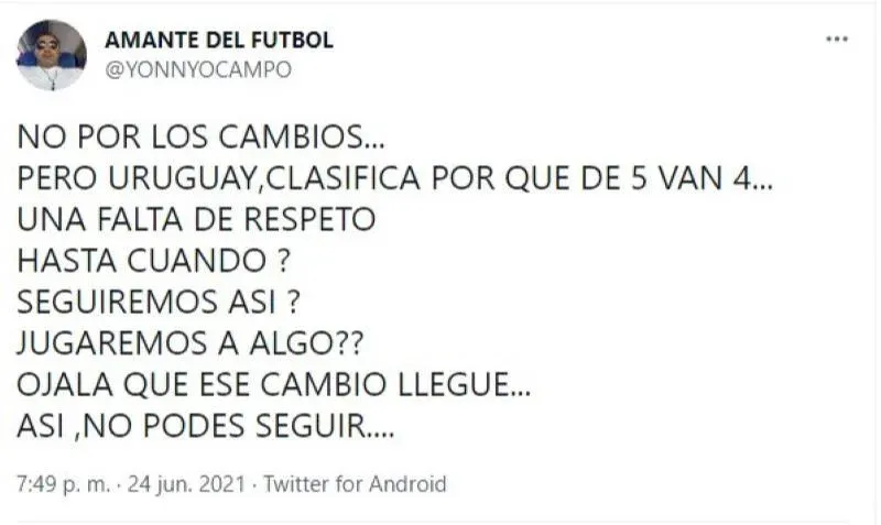 "No por los cambios. Pero Uruguay clasifica porque de 5 van 4. Una falta de respeto. ¿Hasta cuándo seguiremos así? ¿Jugaremos a algo? Ojalá que ese cambio llegue", escribió Yonny Ocampo, papá de Brian, en su cuenta oficial de Twitter luego del encuentro del jueves.