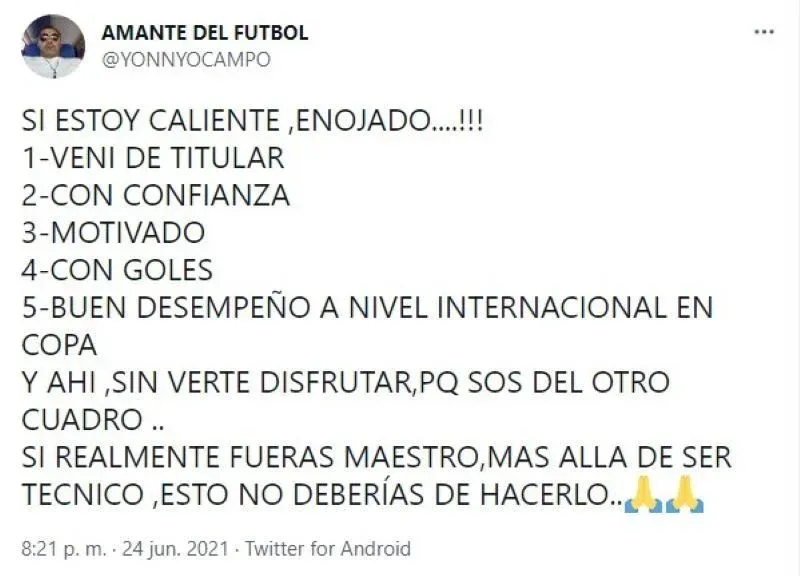 "1- Vení (escribió aunque seguramente quiso poner viene) de titular, 2- Con confianza, 3- Motivado, 4- Con goles, 5- Buen desempeño a nivel internacional en Copa, y ahí, sin verte disfrutar, porque sos (Tabárez) del otro cuadro (ya que el el entrenador celeste fue campeón de la Copa Libertadores de 1987 con Peñarol). Si realmente fueras Maestro, más allá de ser técnico, esto no deberías de hacerlo".