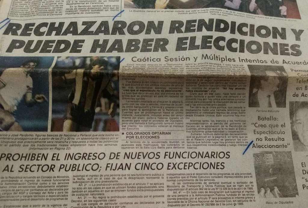 “Minutos antes del vencimiento del plazo, parecía haberse logrado un acuerdo para votar el proyecto de Diputados, pero una llamada de Sanguinetti también frustró ese intento: los colorados votarían el mensaje del Ejecutivo”, dice la crónica de El País.