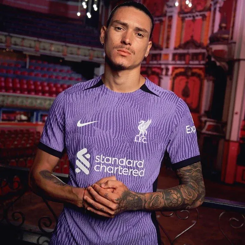 Darwin Núñez con la camiseta violeta de Liverpool, la que utilizará por primera vez este jueves por Europa League