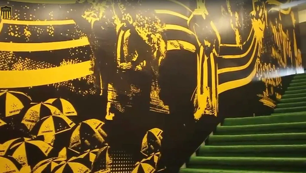 El consejo directivo de Peñarol decidió hace algunos meses arreglar las paredes que comunican los vestuarios con la cancha del Estadio Campeón del Siglo y plotearon ambas paredes de la escalera con distintos pasajes de la historia del club.