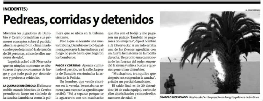 El sábado 22 de mayo de 2004 la palmera de Danubio fue incendiada por hinchas de Cerrito, lo cual generó un encontronazo entre ambas hinchadas a las afueras de Jardines con intervención de la Policía.