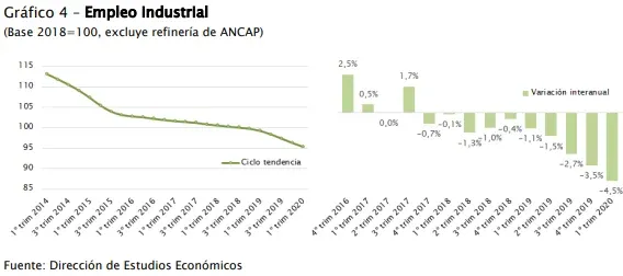 El empleo industrial es una de las variables que más se ha deteriorado ya que ha presentado un marcada caída en los últimos años. En ese sentido, en el primer trimestre de 2020 el personal ocupado disminuyó 4,5% en la comparación interanual.